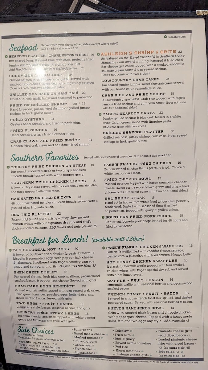 Dishes like Page's Famous Chicken & Waffles and the Classic Charleston Seafood Platter stand out as signature offerings. Reviews from customers depict the chicken and waffles as a harmonious blend of savory and sweet, incorporating cheddar, corn, chorizo, and jalapeño for a uniquely flavorful experience. The seafood platter is described as a deep-fried feast, appreciated by both locals and out-of-towners alike.